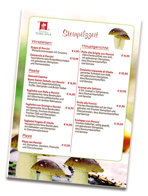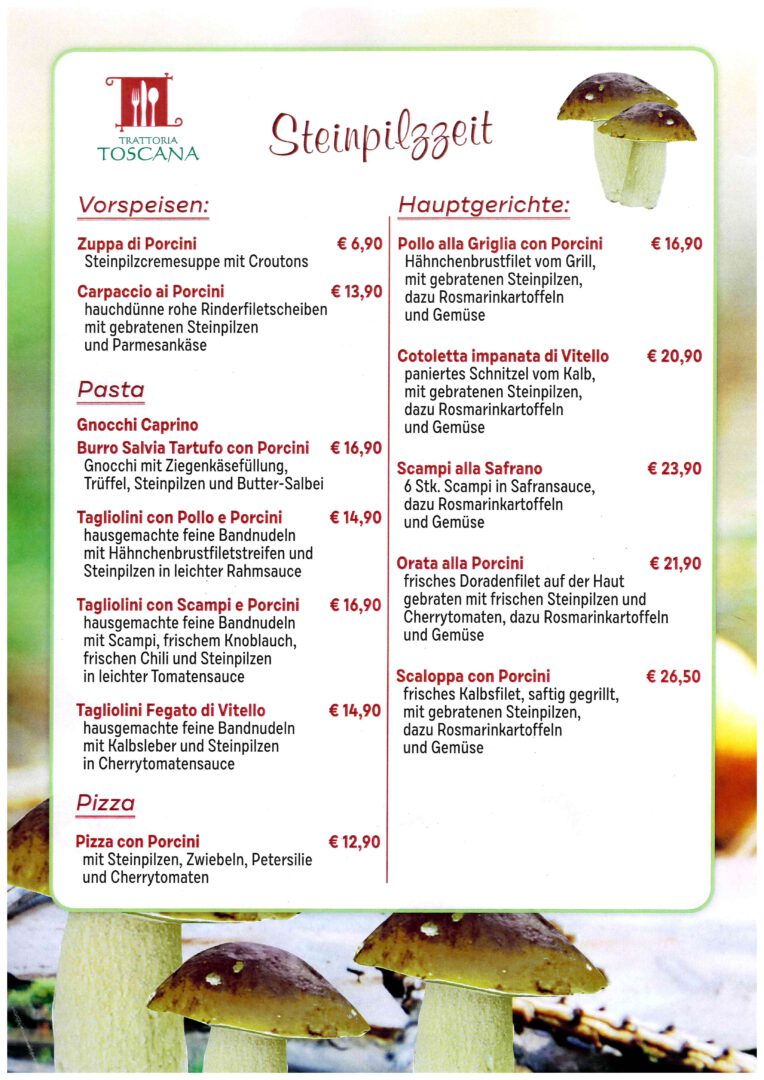 Endlich gibt es wieder Steinpilze in der Trattoria Toscana! Steinpilze sind geschmacklich eine echte Delikatesse. Sie sind für ihren herrlich nussig - milden, aber dennoch intensiven Geschmack bekannt und heißgeliebt. Auf unserer Extra-Karte bieten wir Ihnen jetzt wieder verschiedene Variationen mit dem beliebten Pilz an.