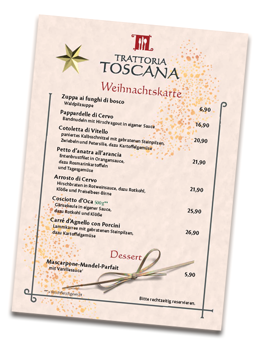 sehr gutes Essen und hervorragender ServiceEin wirklich hervorragendes Restaurant. Wir wurden herzlich empfangen und unser Covid Status (2G) wurde geprüft bevor wir an den Tisch gehen durften (völlig OK!!). Der Service war sehr aufmerksam und hat auch unser Sonderwünsche für ein Essen das so nicht auf der Karte steht aufgenommen und uns sehr gut beraten. Das Essen war hervorragend. Meine Hoffnung das aufgrund des Namens das Restaurant auch Spezialitäten aus der Toskana anbietet hat sich leider nicht erfüllt, aber die Karte bietet wirklich viele tolle Sachen an. Wir kommen bestimmt wieder